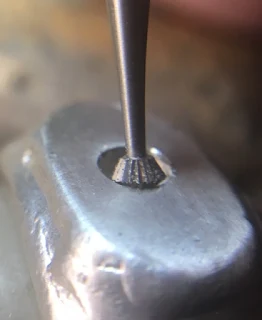 Here is the bearing ready to accept the stone. Please make that there is no metal-carving residue left inside the bearing cut. Therefore the stone will not be where you want it to be and the stone will be resting against the metal shards.